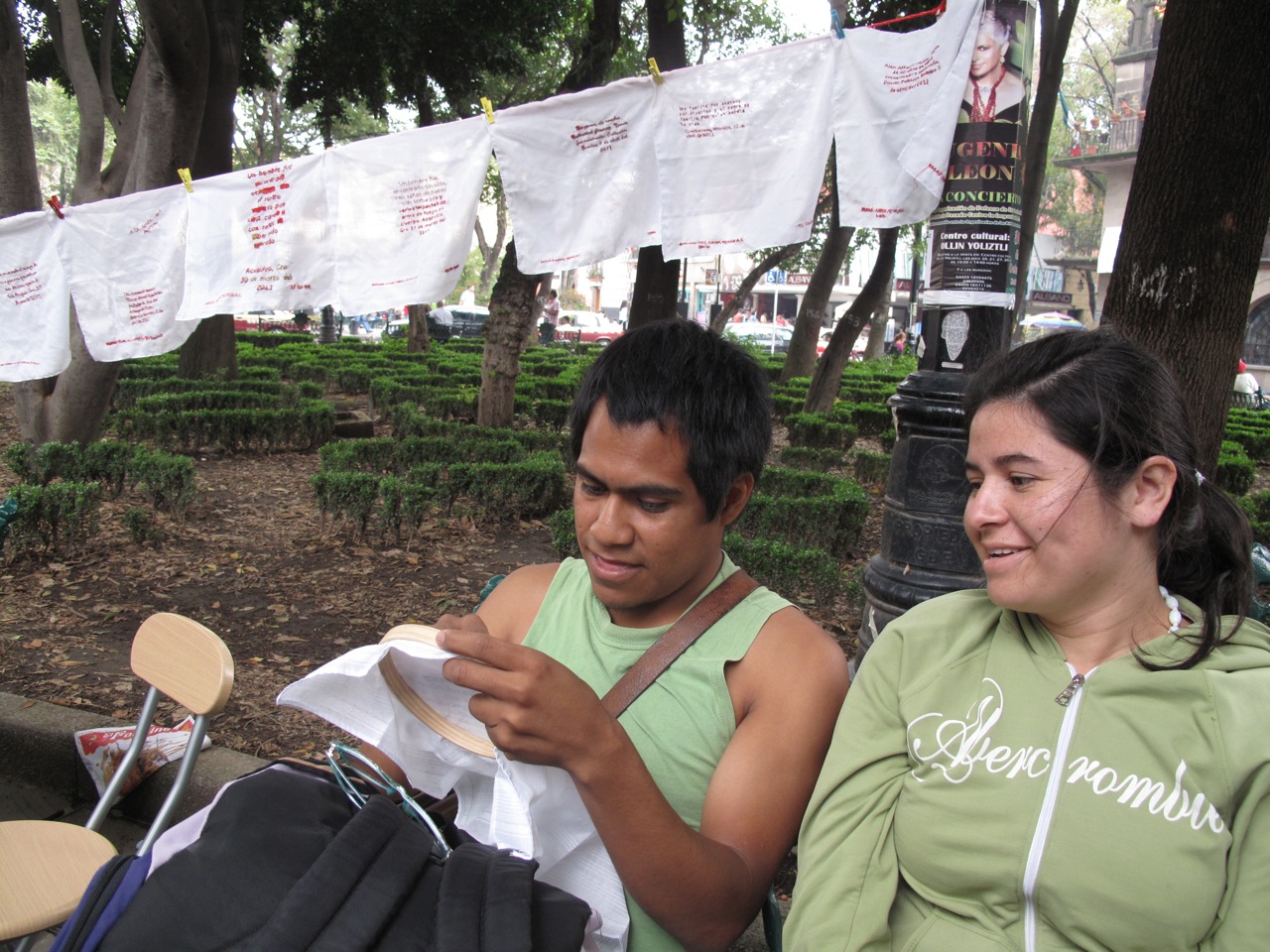 El colectivo “Fuentes Rojas” propone una acción que consiste en bordar un pañuelo con el nombre o descripción de cada uno de los 50 000 muertos de la guerra contra el narco.